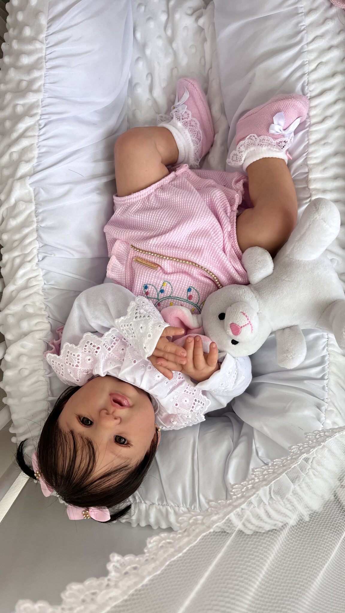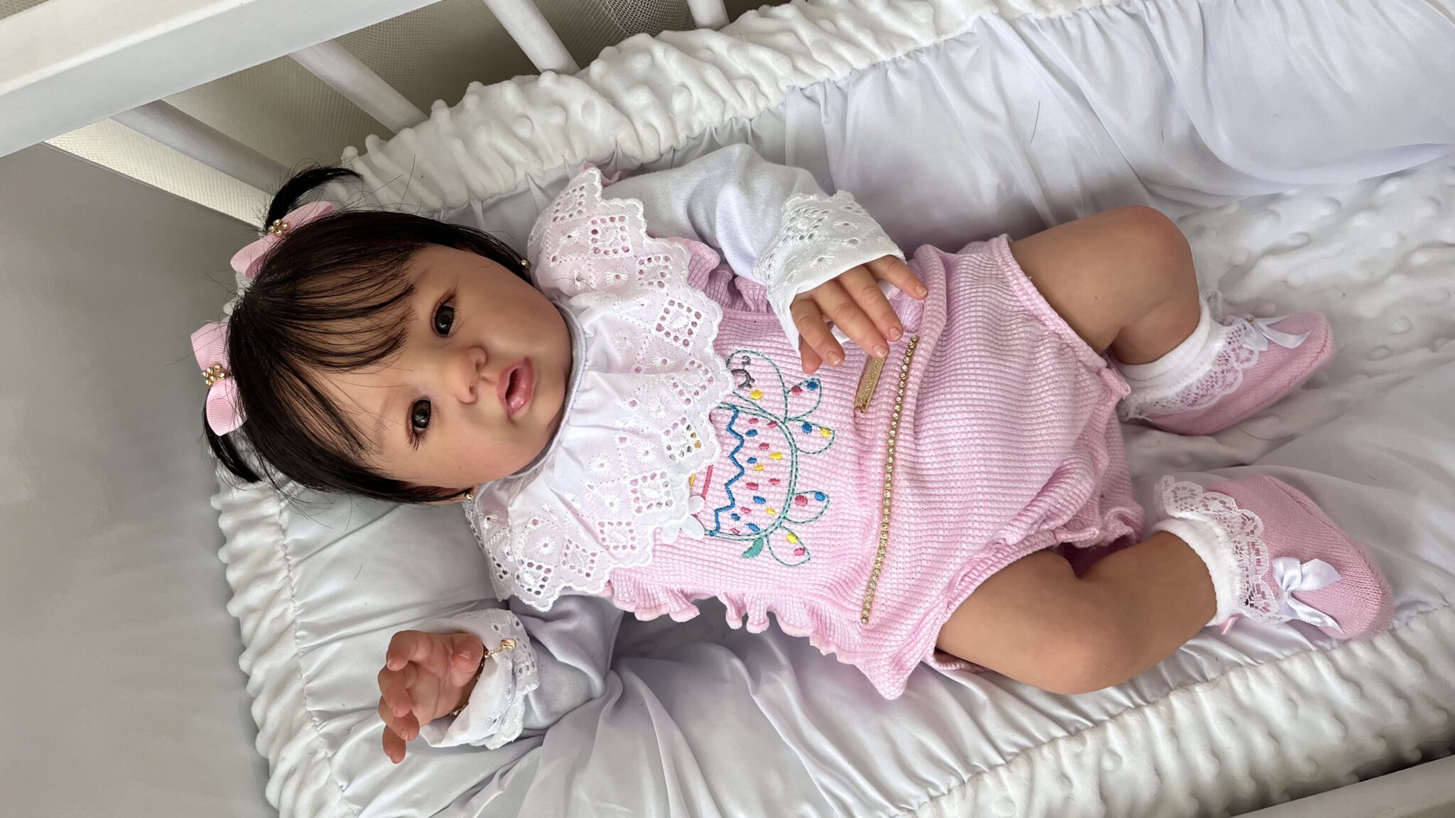 Corpinho em tecido em suede na cor claro Membros em vinil lcd macio . Feita com técnica de pintura avançada . Com detalhes que nos encanta . Como: profundidade de pele , marquinha de vacina,teste do pezinho , veias , micro vasinhos, sobrancelha , cílios . cabelo implantado fio por fio com beautex